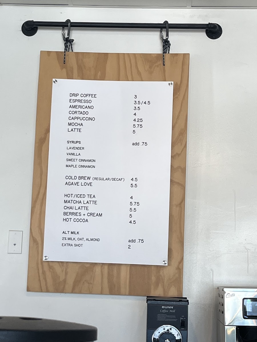 - Drinks: The beverage menu includes various espresso-based options such as Americano, Cappuccino, Mocha, and Latte with customizable milk and syrup choices. Cold beverages like Iced Coffee, Iced Lavender Latte, Iced Vanilla Lavender Latte, and Iced Matcha Latte are also available. Specialty drinks include Chai Latte, Hot Cocoa, and seasonal or unique items like Agave Love Shaken Cold Brew Concentrate.